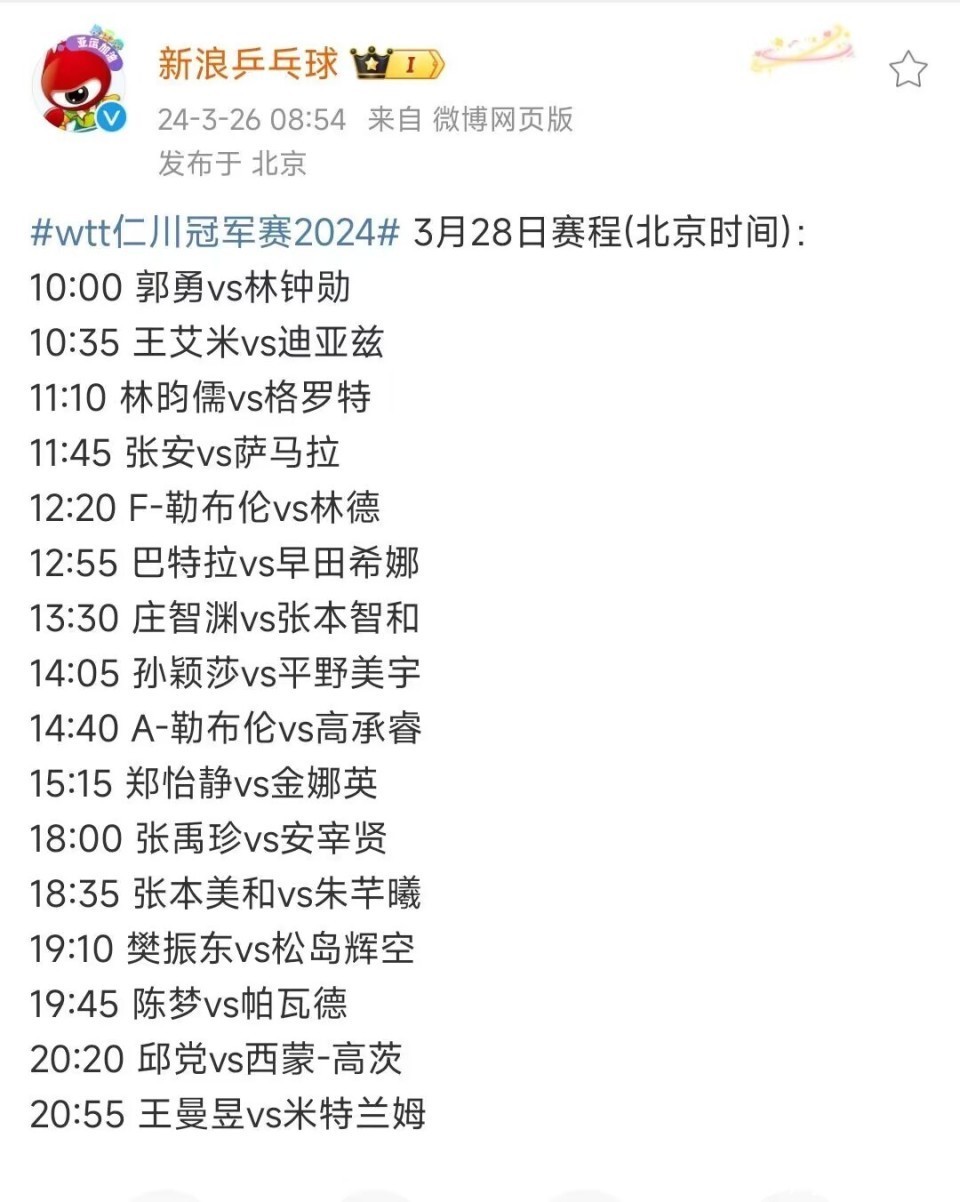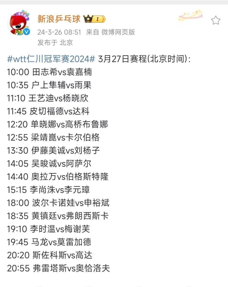 (一)2024年3月28日14:05,WTT仁川冠军赛第一轮:孙颖莎VS平野好意思宇,央视CCTV5选择性直播,咪咕体育全程直播。孙颖莎,国乒女队新一姐,差一个奥运会女单金牌,即可拿到“乒乓球大满贯”,成为国乒女队现役第一东谈主。因此,在奥运年中,孙颖莎需要保合手健康,改造气象,精神相聚,松紧有度!因为在WTT新加坡大满贯之上,孙颖莎以1-3不敌队友陈幸同,让咱们球迷有些病笃。与之比拟,平野好意思宇来势汹汹,气象高出好,拿到奥运会女单经验的平野好意思宇,大约充满了信心,在前不久力克早田希娜!得手之后,平野好意思宇高出欢笑,连蹦带跳的。是以,这场比赛,龙争虎斗,期待期待!